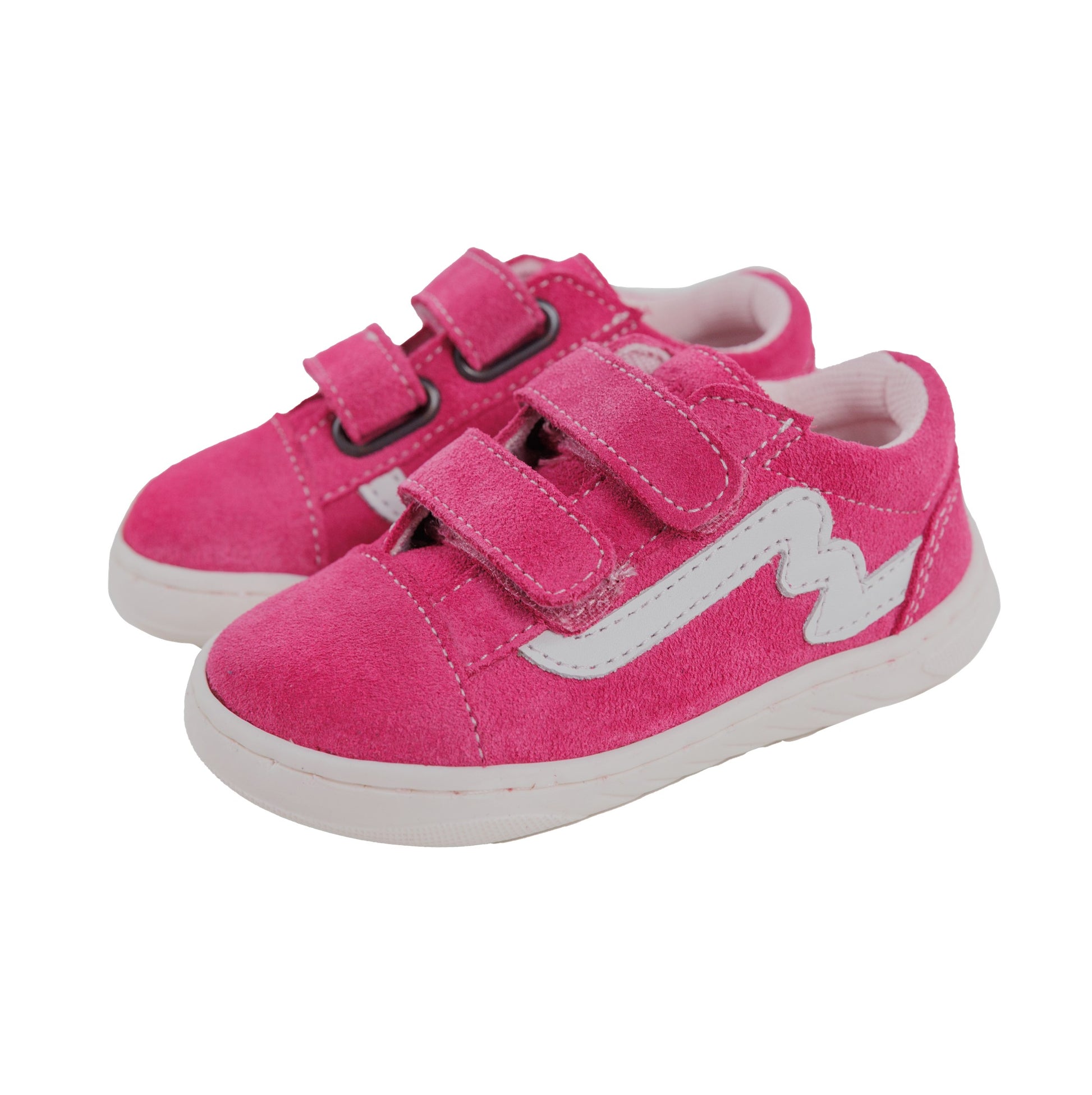 Sapatilhas em fucsia feitas em camurça com ponteira ampla, sola dura, fina (3 mm), flexível e sem desnível, e palmilha lisa.